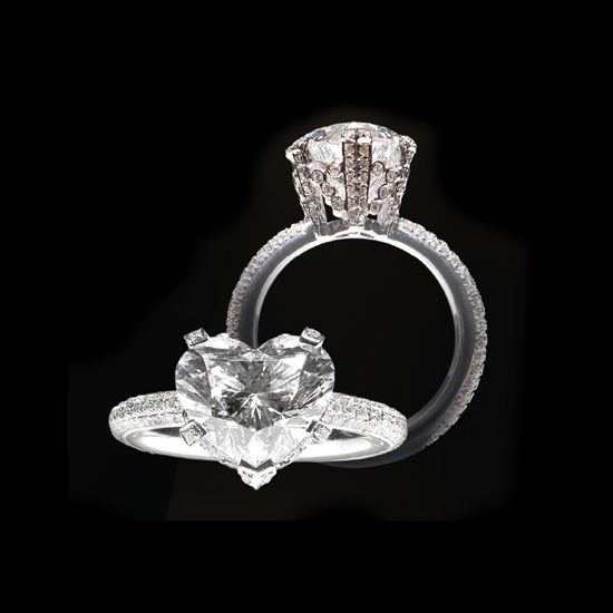 This magnificent ring features a sparkling heart-shaped diamond as its center stone. It exhibits excellent polish, perfect symmetry and incredible florescence. This beautifully crafted ring is undoubtedly the ultimate bridal rarity.