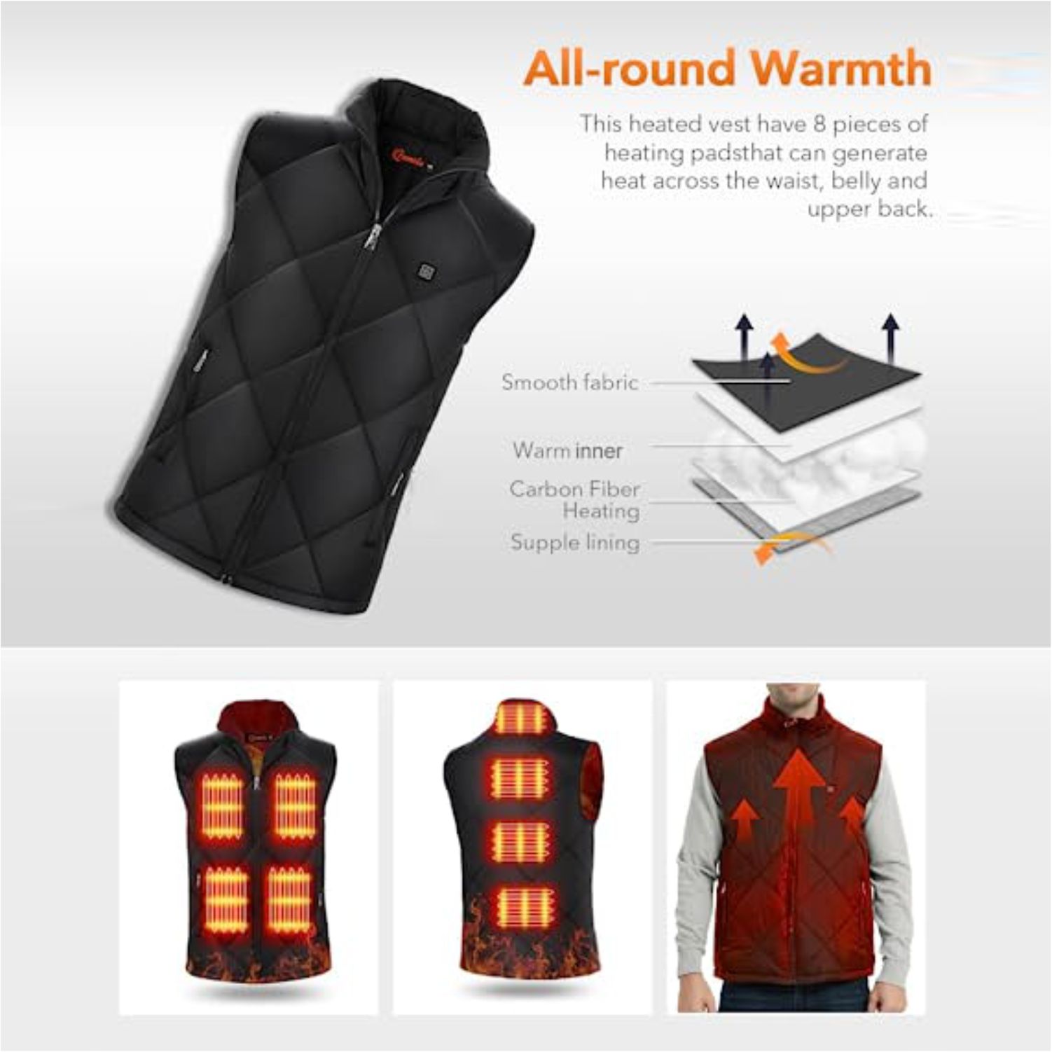 Super Warm Heated Vests : Electrtic heating vests are designed with the latest carbon fiber and high-quality TPU heating sheet, which have better warmth retention.8 carbon fiber heating elements generating heat across the collar, waist, belly as well as upper back for core-body warmth. Fast heating within 30 to 50 seconds can save you time and make you warm quickly in winter.
