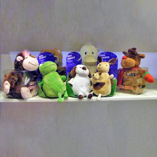 The featured items are stuffed toys which can be microwave heated. The stuffed toys come in cute animal designs like dogs and kangaroos and would be an ideal gift for children.