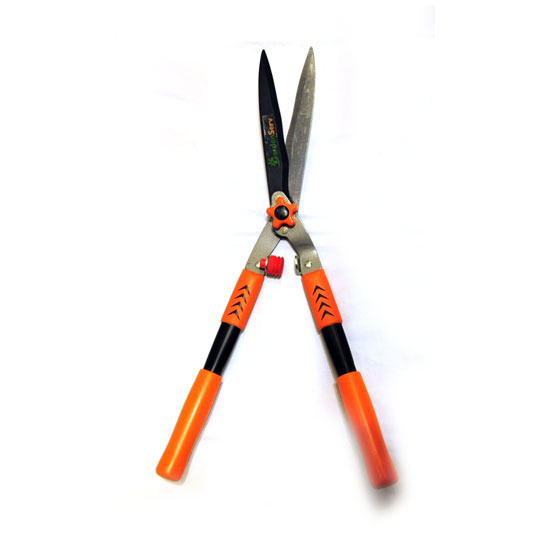 Featured here is a pair of hedge scissors with a rugged construction. The air-bag design helps reduce vibration. This pair of hedge shears is a great addition for gardeners.