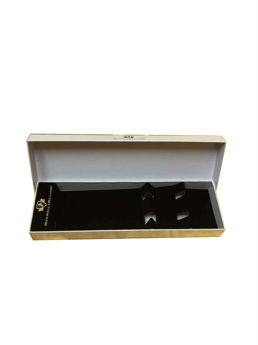 This packaging box is crafted of art paper and paperboard in an elongated structure. The velvet insert card provides extra protection for the contents. This hinged paper box is ideal for packaging a diverse collection of cutleries and eating utensils.
