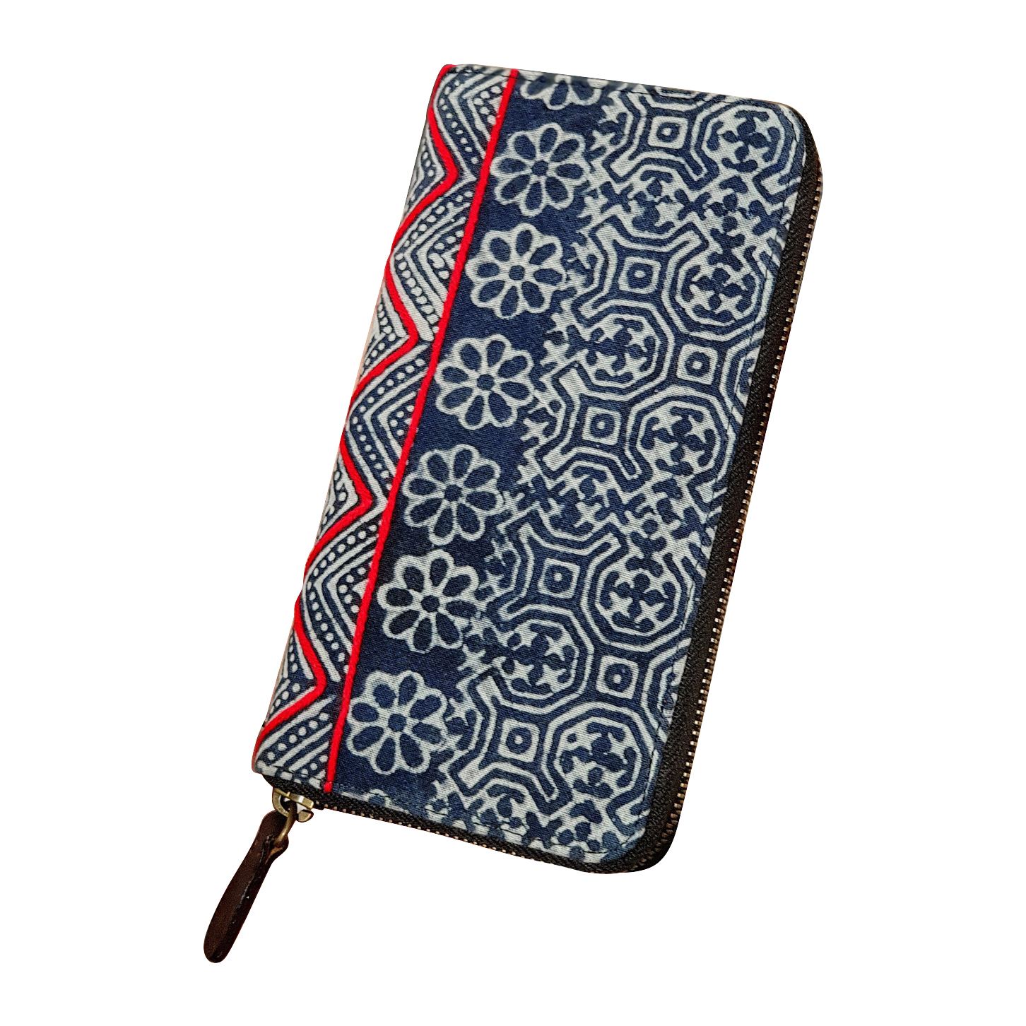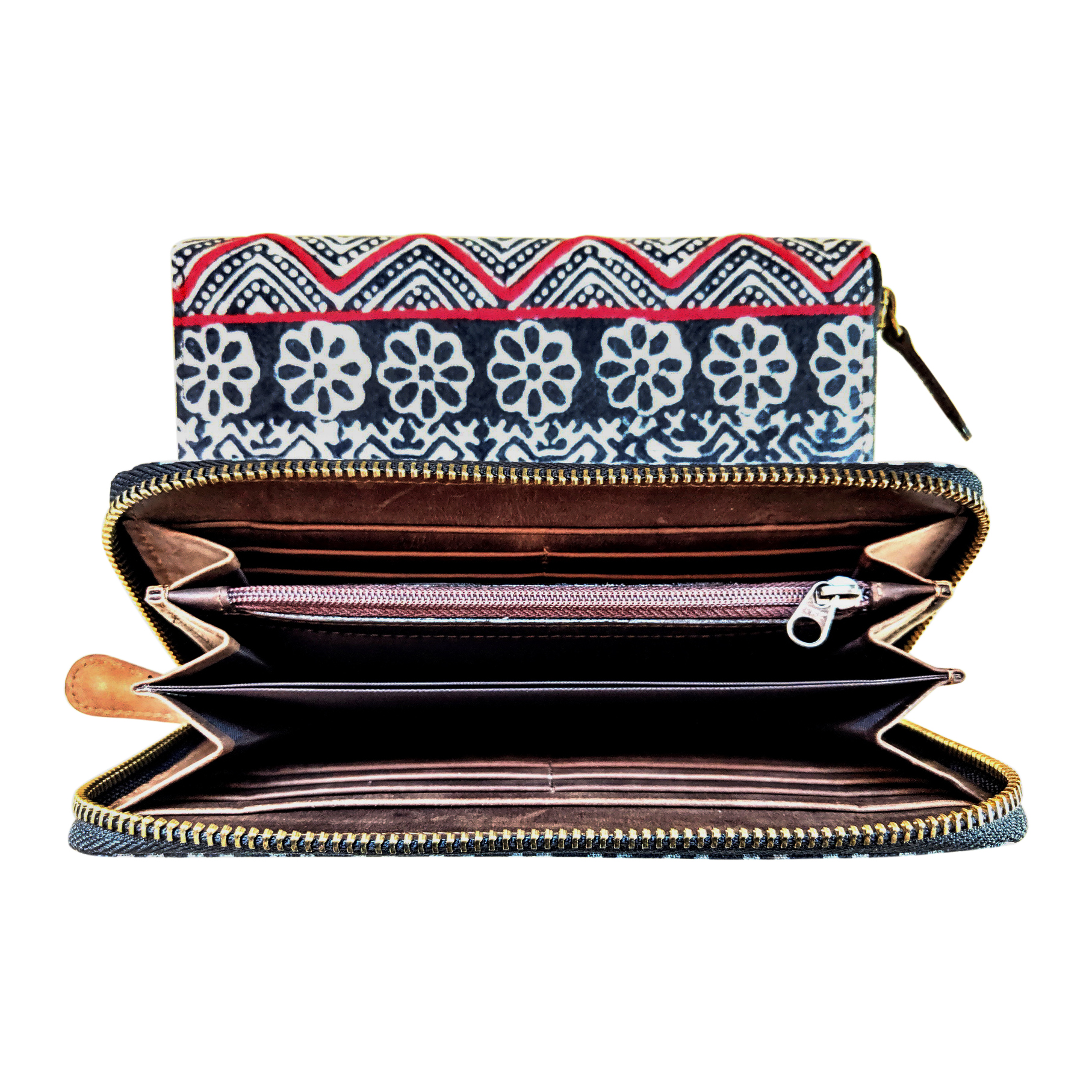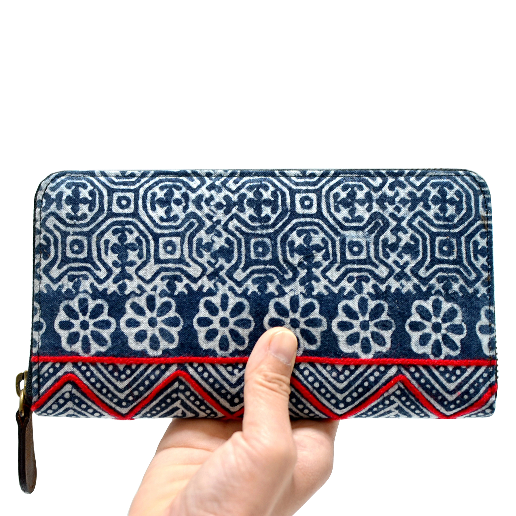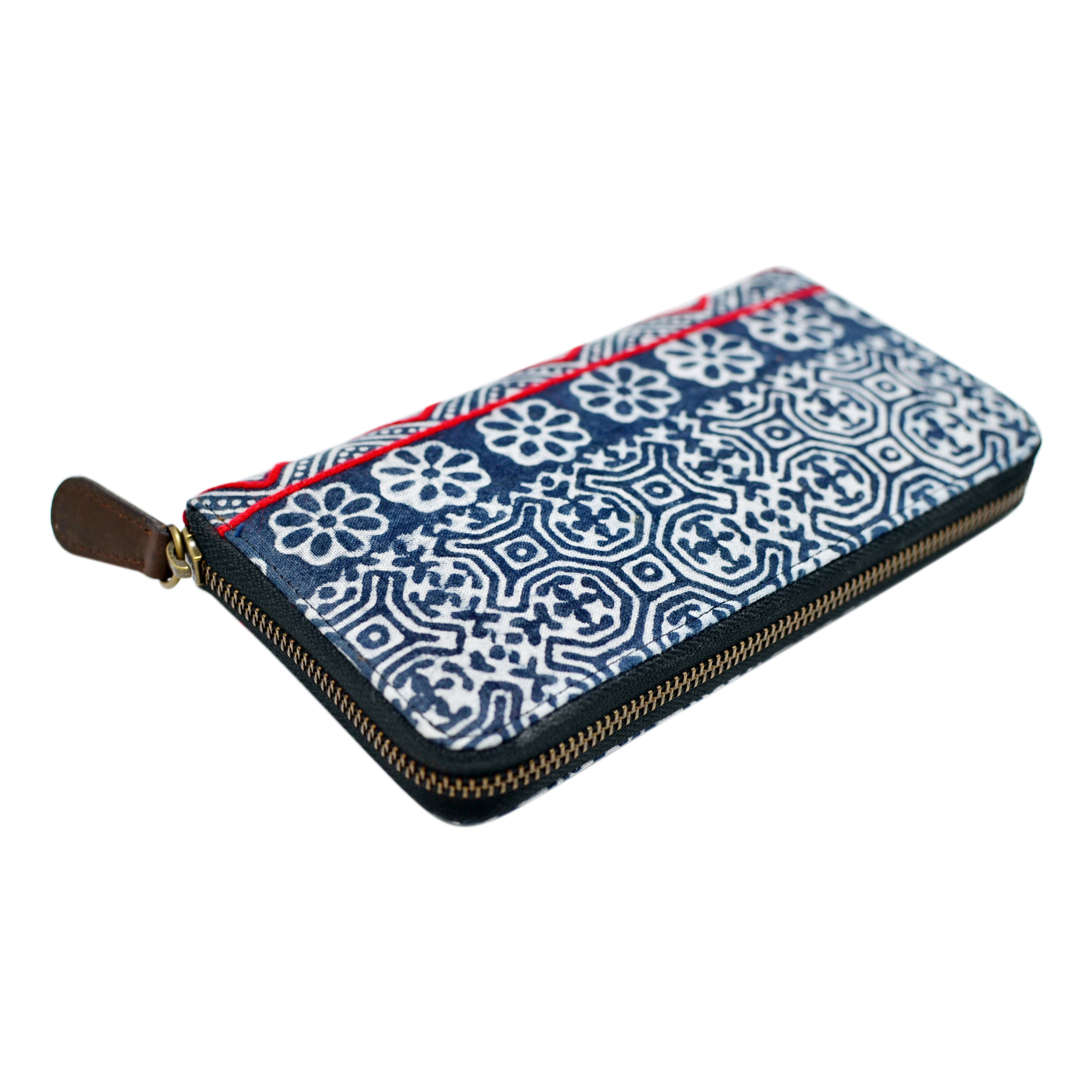This long zip wallet is made of Hmong Batik Cotton and genuine cowhide leather with the Hmong style design. The zipper closure ensures the safety and security of the belongings. There are 12 card slots, one zip compartment for coins and a few long compartments for banknotes and receipts.