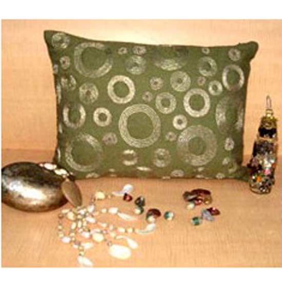 The classy rectangular-shaped cushion flaunts a modest design in dark green. Dexterous craftsmanship is unveiled without reservation by the silvery circular details, bringing out an intriguing appearance to adorn your home. Class up your home decor with the help of this beautifully made cushion.