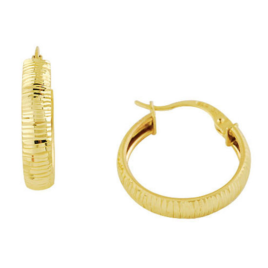 This pair of golden hoop earrings is a fashionable accessory for summer. The matte scratch patterns add a fresh touch to this jewelry. These subtle earrings complement your look with style and sophistication.