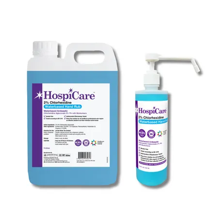 HospiCare 2% Chlorhexidine Waterbased Hand Rub is a rinse-free formulation which contains 2% w/v Chlorhexidine digluconate, effective in killing 99.99% harmful germs. The hand rub is ideal for hospitals, nursing homes, healthcare institutions, homes, public spaces such as schools, commercial and industrial premises, and facilities.