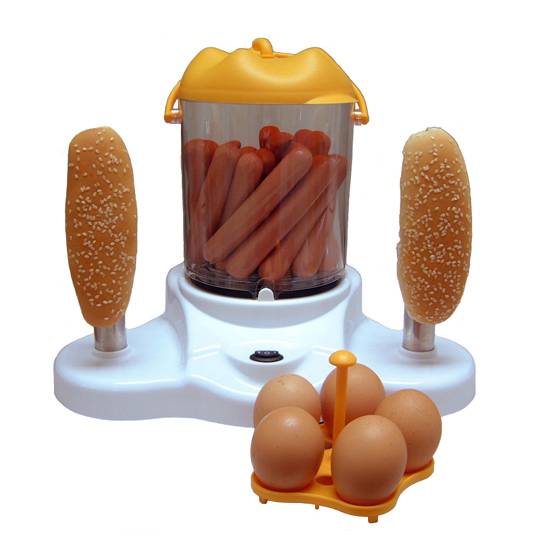 This hot dog maker is a all-in-one tool for hot dog making. It is featured with a transparent cooker and container for steaming sausages; it is also designed with 2 built-in bun warming spikes. The design of non-stick coated reservoir ensures easy cleaning.