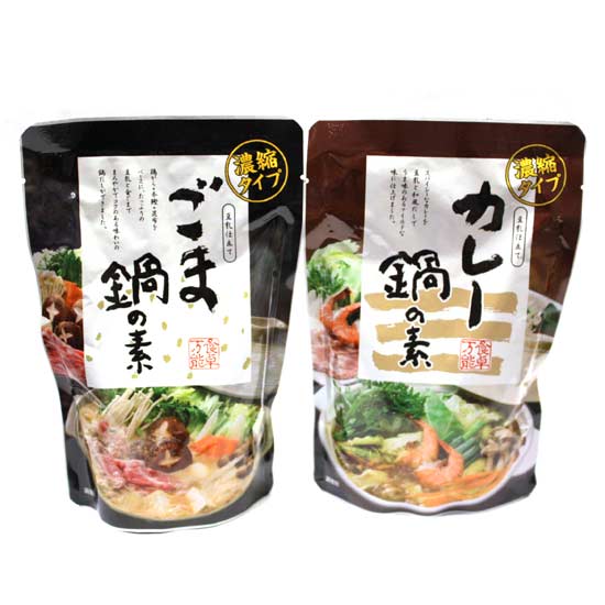 Displayed is a bag of hot pot soup that comes with flavors of sesame and curry. The condensed soup can be prepared with boiling water. This hot pot soup is a delicious enhancement for meat and vegetables.
