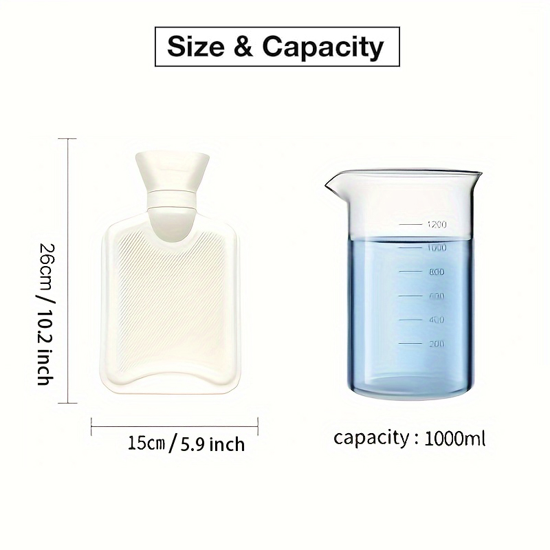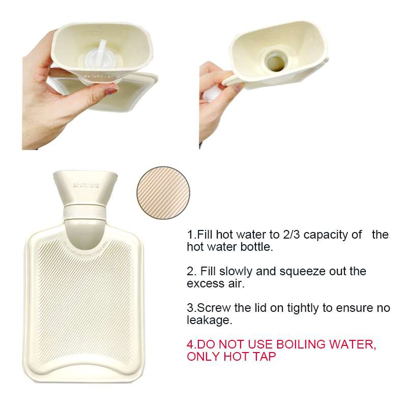 Water safety: The rubber hot water bottle with waist cover is very safe when water comes in and out and prevents water from splashing again. The maximum capacity of the hot water bottle is 1000 ml. It is recommended to add two thirds of water during use and the hot water should not exceed 80°C.