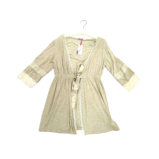 This is a ladies' house coat with a dainty and chic design. It comes in gray with exquisite lace and ribbon accents. The soft and comfortable modal fabric gives you enhanced comfort.
