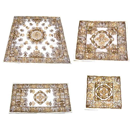 These textile madeups include handicrafts, table covers, mats and napkins. They have enchanting floral pattern. They have drops in matching color on edges.