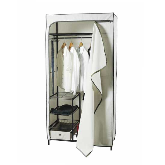This is a deluxe wardrobe for home use. The zipped closure allows easy opening and closing. It is equipped with rods and racks for better organization.