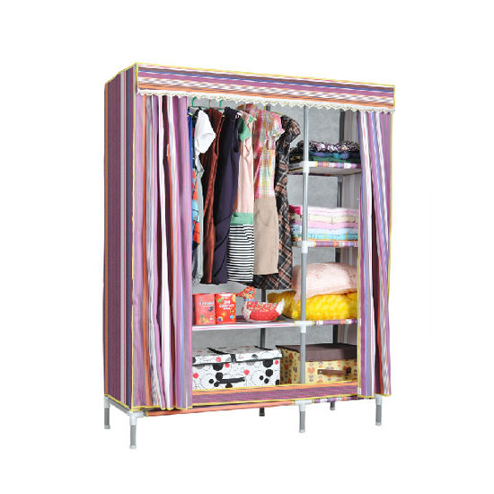 This is a household wardrobe that is easy to assemble. It is sturdily constructed for a long service life. This wardrobe comes with a fabric cover which is printed with colorful stripe patterns.