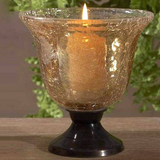 This hurricane has a crackled glass in golde color and brass base in dark brown color. Mark of crackled glass give a special and beautiful feature to this hurricane. Round base makes it not easy to be turned over.