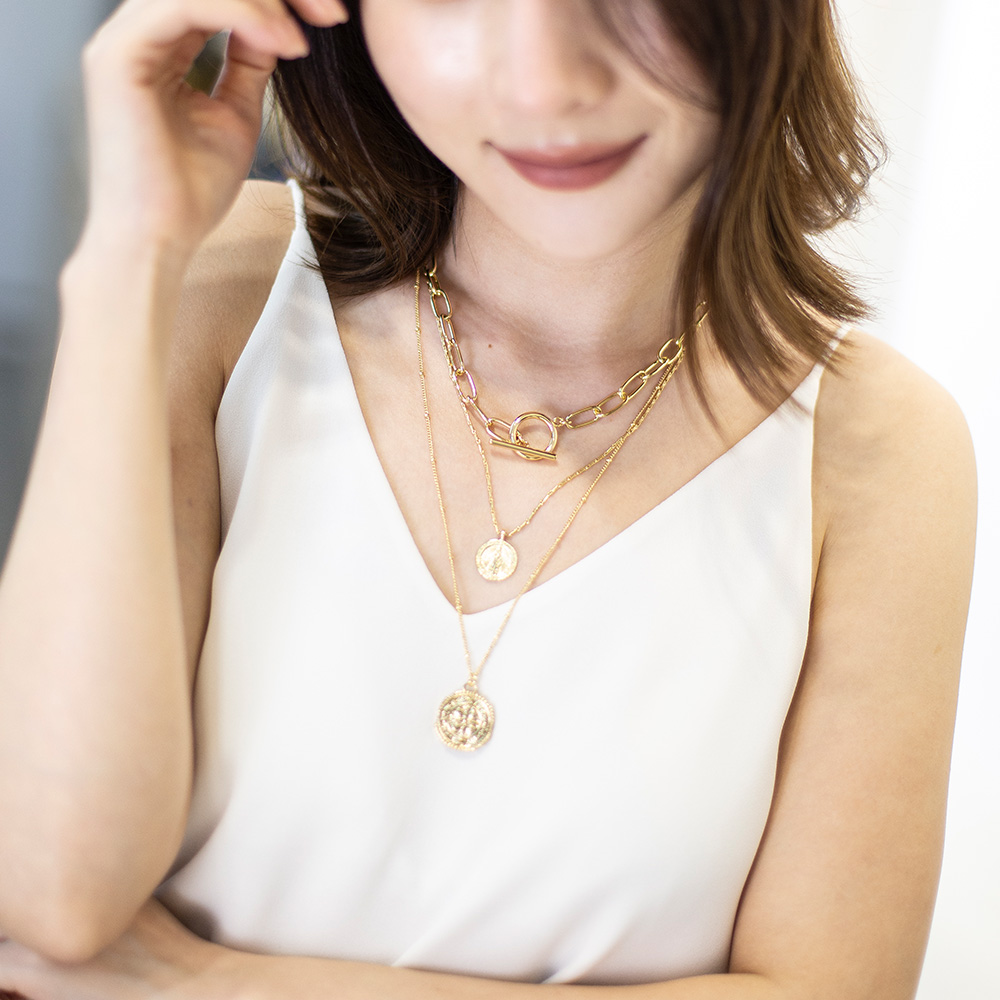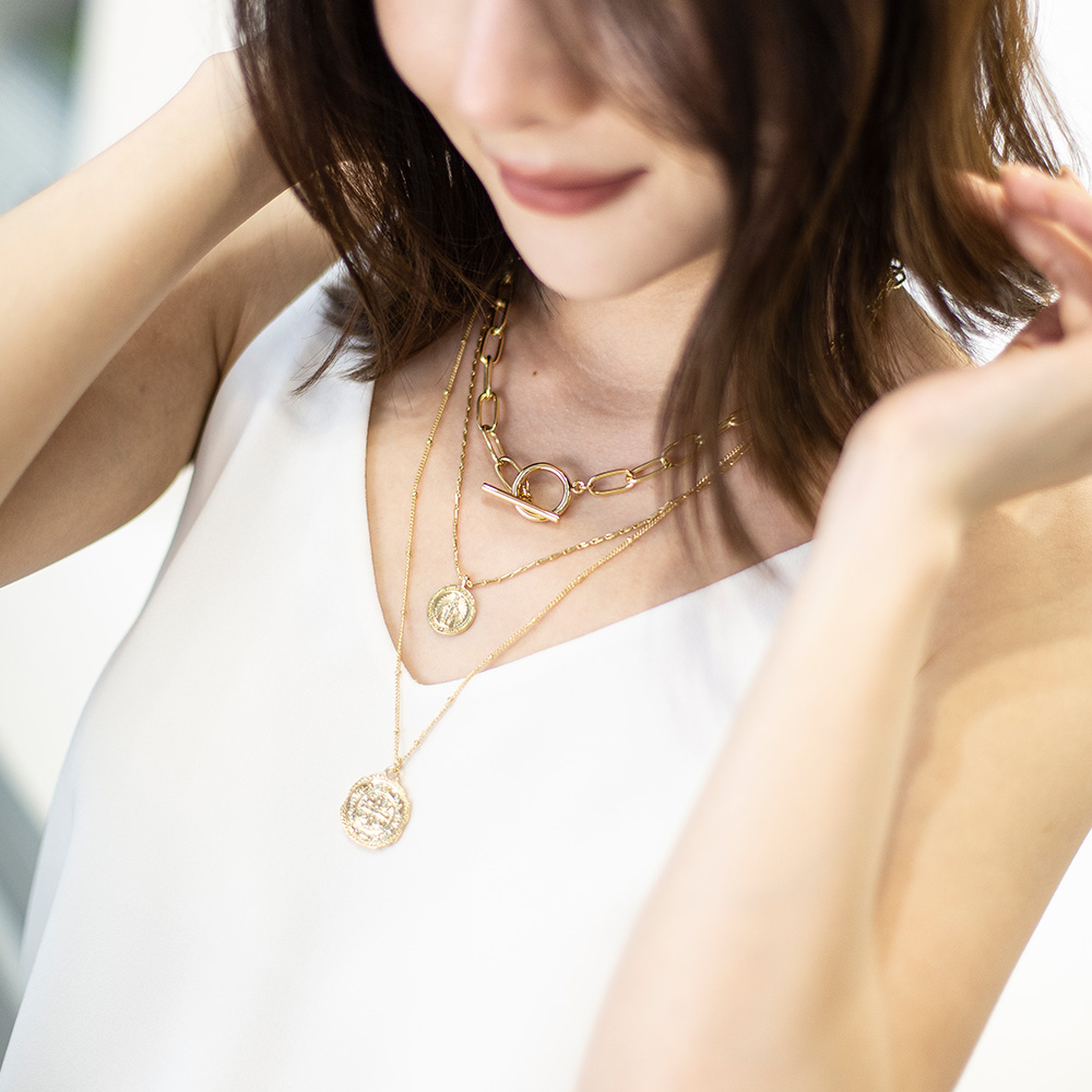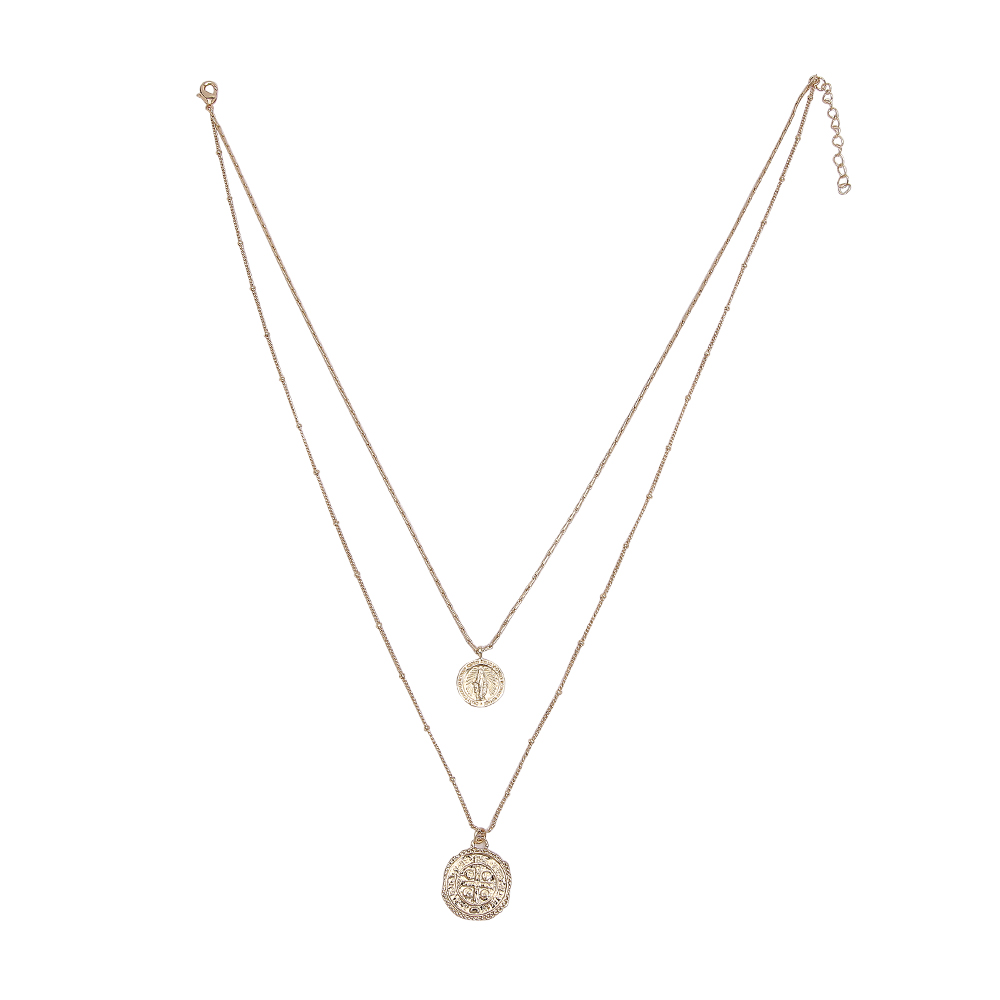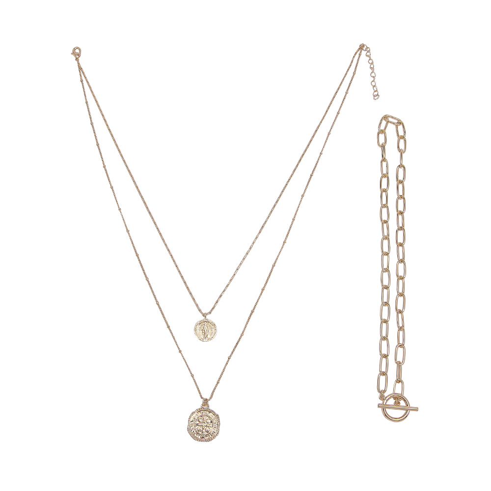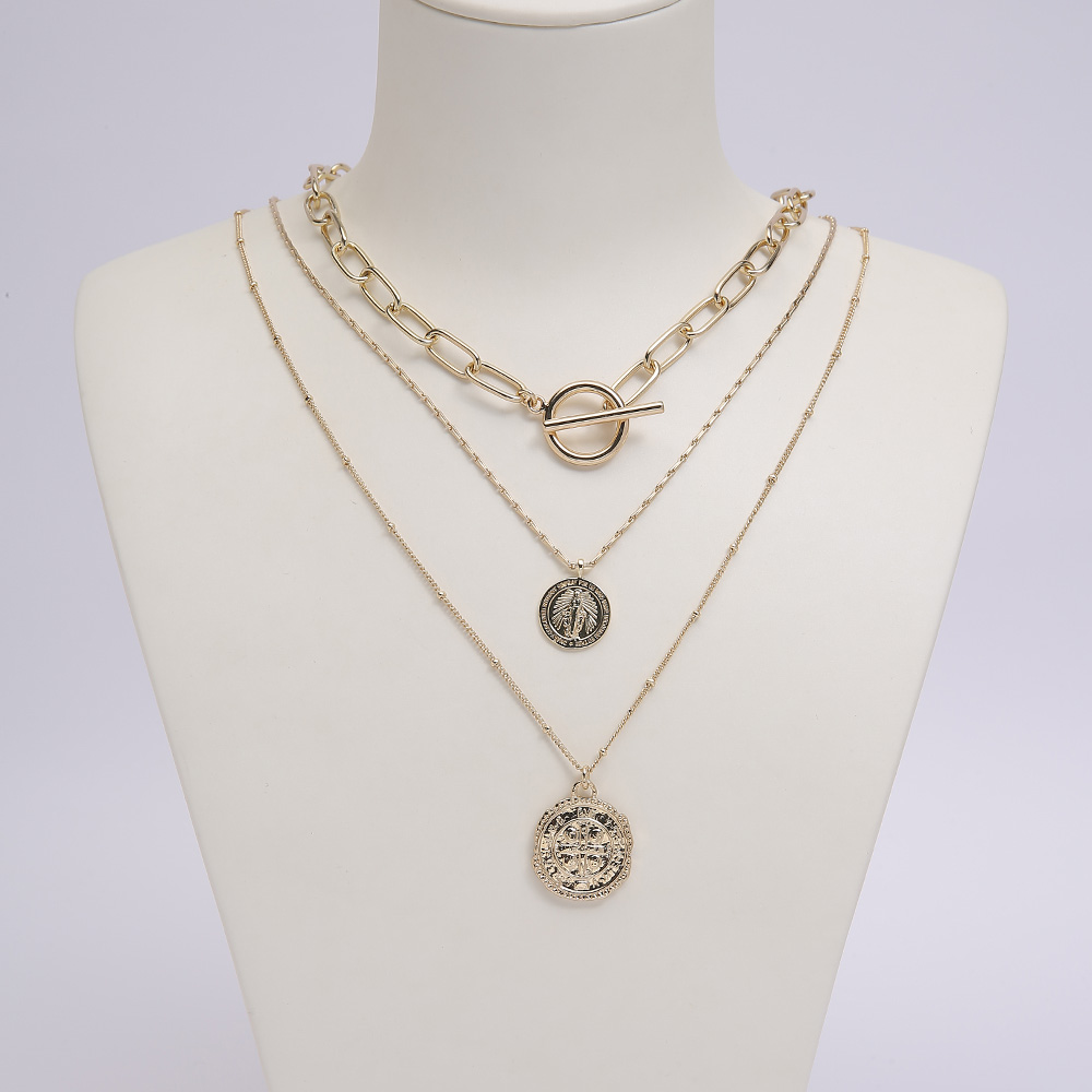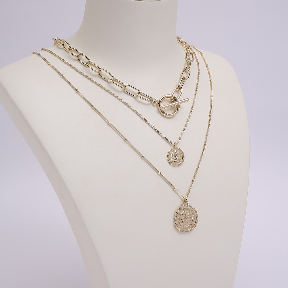 I.M.12k Gold Plated Alloy Paperclip Link Triple Necklace Disc Paperclip Chain Face Portrait Pendant Necklace