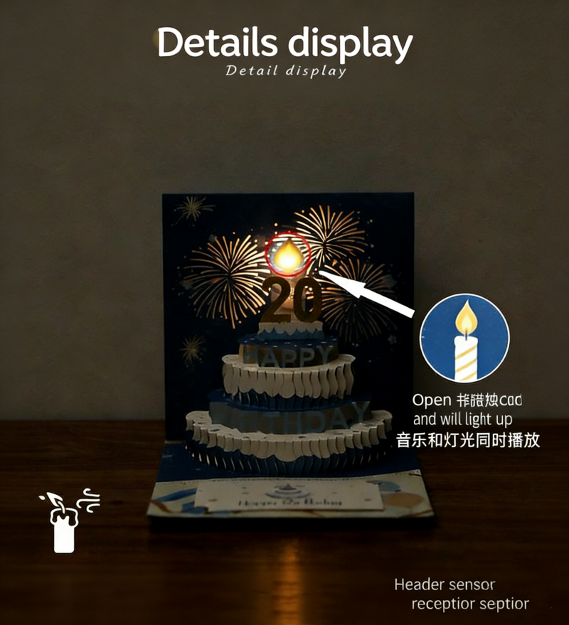 - Blow-to-Activate Candle: Realistic candle design, blow gently to trigger lights and music.