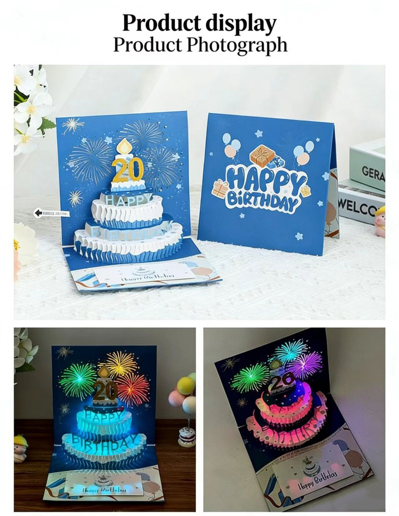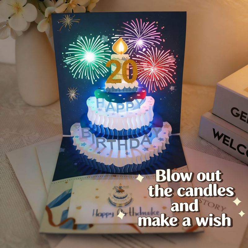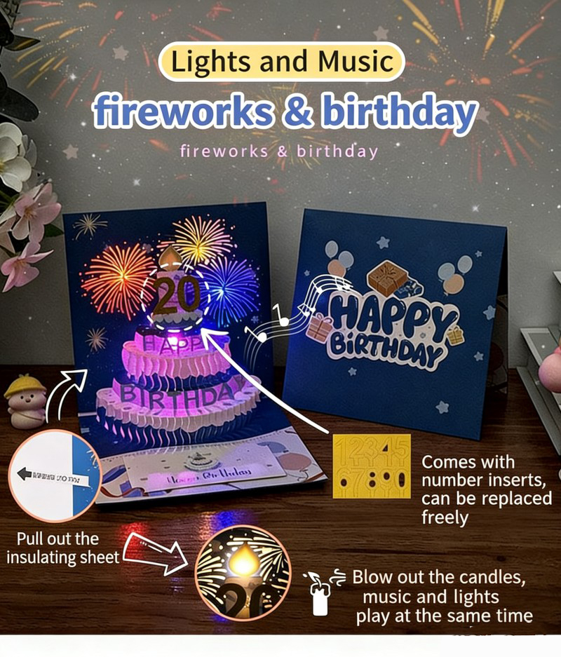3D Music Fireworks Birthday Card, Blow Out Candle Pop-Up Greeting Card, INS Style Handmade Folding Card