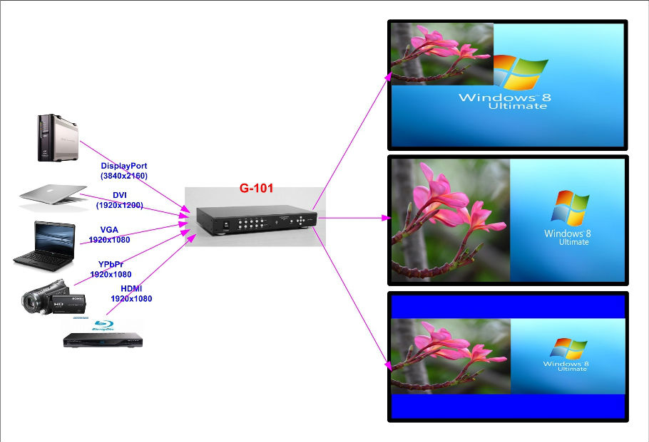 - Input and output:Video Input: 1xHDMI, 1x VGA, 1x DVI, 1x DP, 1x YPbPr
