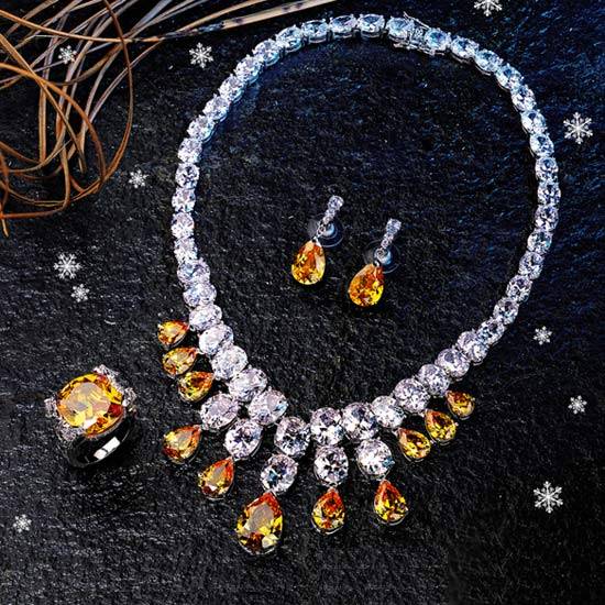 This is a jewellery set. It includes a necklace, a ring and a pair of earrings. The necklace is composed of imitation diamonds and has dangling imitation topaz stones attached.