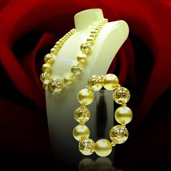 This is a set of imitation jewellery. Included are a necklace and matching bracelet. They are made of golden imitation pearls and crystals to create a graceful and gorgeous look.