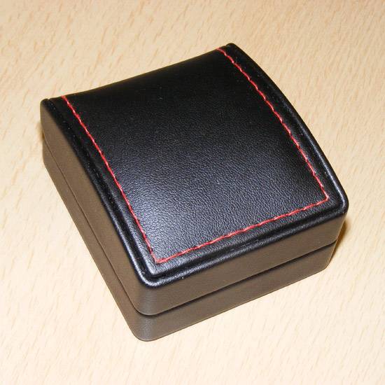 The picture shows an imitation leather jewellery box made of plastic. The black rectangular box is adorned with red stitching on top, which presents a simple design which can highlight the beauty of any fine jewellery or costume jewellery rings or earrings.
