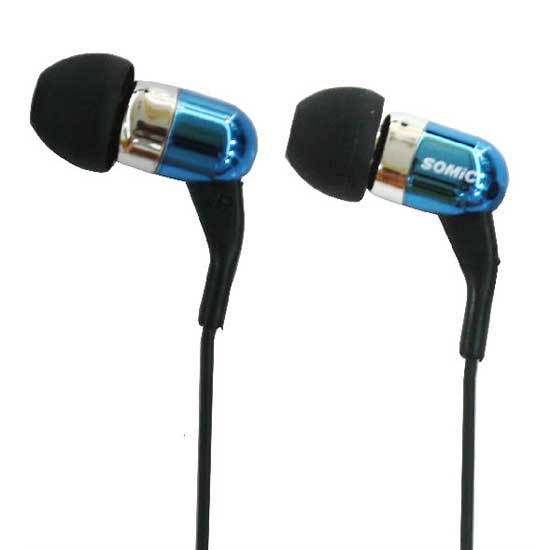 This pair of earphones features a glossy appearance in blue and silver. The in-ear design guarantees maximum noise reduction. These professional earphones are ideal for music lovers.