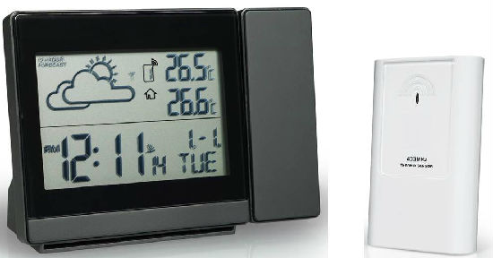 - Display of Time, Date, Weekday with in/out Temperature and weather forecast