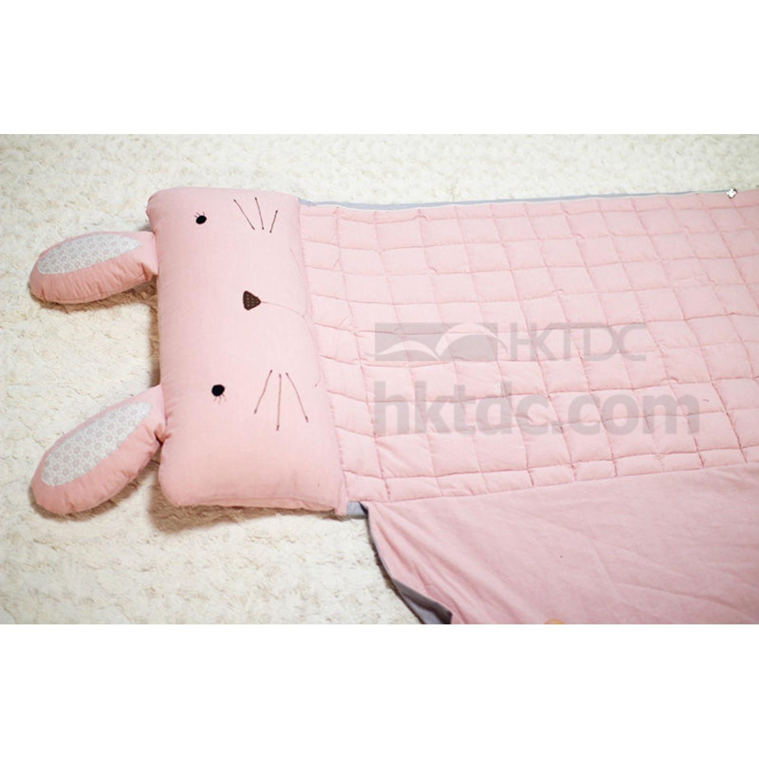It is a comfy nap mat decorated with pink rabbit pillow and grey dot-patterned fabric.