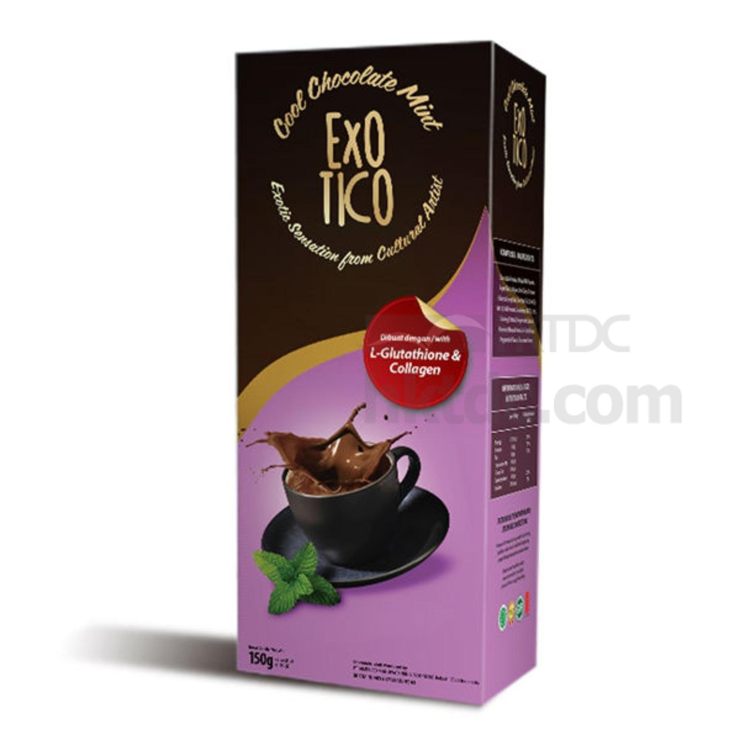 Exotico Beauty Choco is a powder drinks of chocolate with mint sensation, contains Fish Collagen, L-Glutathione, with Vitamin & Mineral.