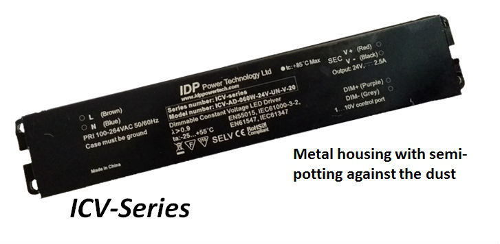 Highlighted here is a constant voltage LED driver for indoor lighting applications. It comes in a slim rectangular shape and has mounting plates on the sides for installation. This constant voltage LED driver provides reliable performance and has excellent resistance against dust.