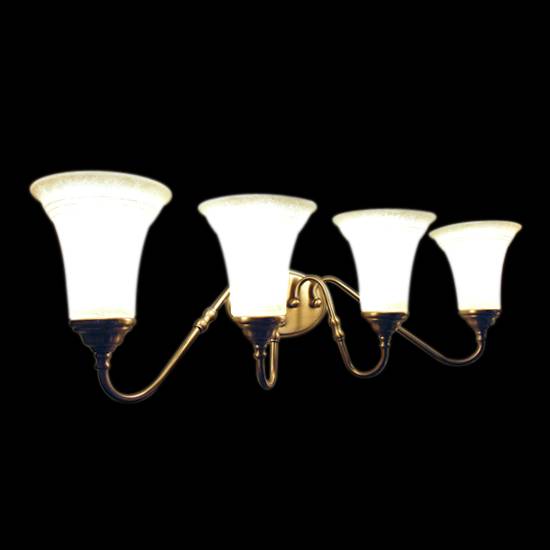 The indoor wall lamp has a brush nickel frame to hold 4 opal glass lamp shades. Its classical and delicate design and soft lamplight brings elegant ambience to surroundings. It is suitable to be used in bathroom vanity.
