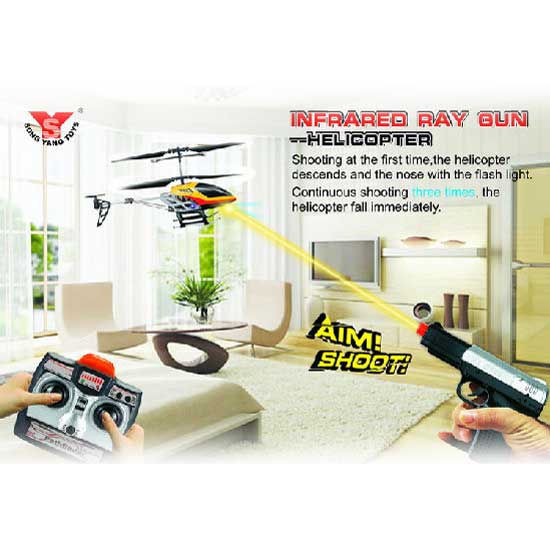Displayed is an infrared helicopter that features 3.5 channels. For additional fun, this helicopter comes with a toy gun for shooting it down. This toy helicopter is made of high quality materials for durability.