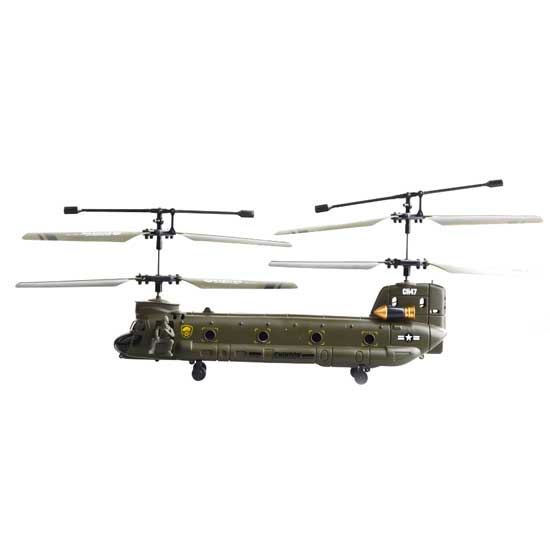 This infrared remote-controlled helicopter features an army green body in a sleek design. The two sets of double rotors gives the chopper excellent gliding. A soldier figurine is placed at the cockpit for added fun.