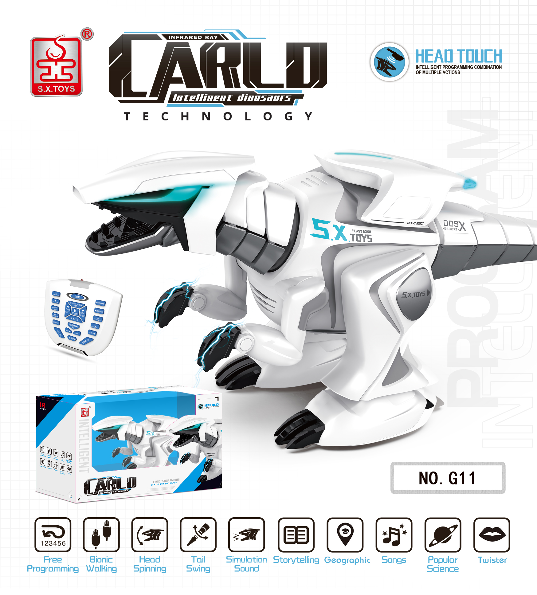 Infrared remote control,go forward/backward,slide function,fast and slow speed adjustment,turn left/ right,rotation,machine language,free programming,science knowledge,stories,learning English,math,songs,dancing,volume control,hand joint movement