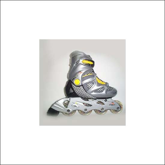 - The skate has 4 wheels in a line and is in silver and yellow with black dots