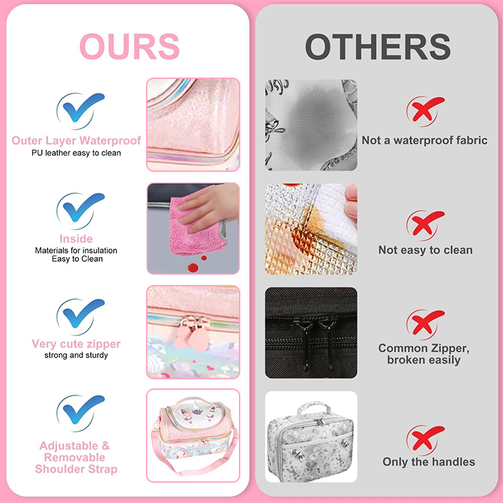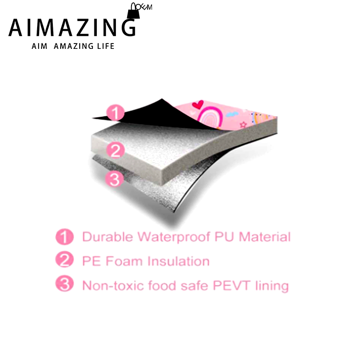 1.Adorable cartoon-designed kids' lunch cooler. Waterproof PU, PE foam insulation, and food-safe lining keep lunches fresh.