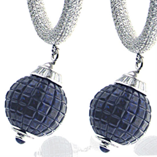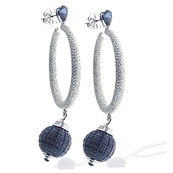 Carat size tear drop Ceylon sapphires holds the delicate full pave' hoops in 13 carats of white diamonds. An invisibly set sapphire ball hangs precariously at the end of the hoop.