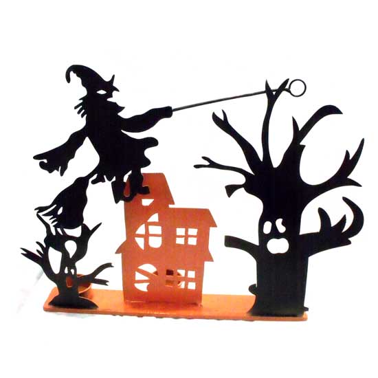 The delicately crafted candle holder flaunts a humorous Halloween theme. The adorable tree and building plates stand in front of 3 flickering candles to create mysterious light that best suits the most fearful yet fun festival of the year. Celebrate Halloween with your friends by decorating with this whimsical candle holder.