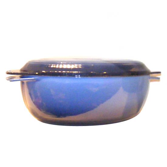 blue enamel cast cookware which is made out of high heat conductive iron, comes with a iron lid that with the handles on the sides, used for simmering or boiling.