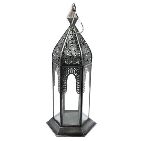Highlighted is an iron lantern with a base in a shape of hexagon that showcases a touch of uniqueness. The stylish hollow-cut decorations add sophistication to the entire piece. Accessorize your living room with this beautiful iron lantern.