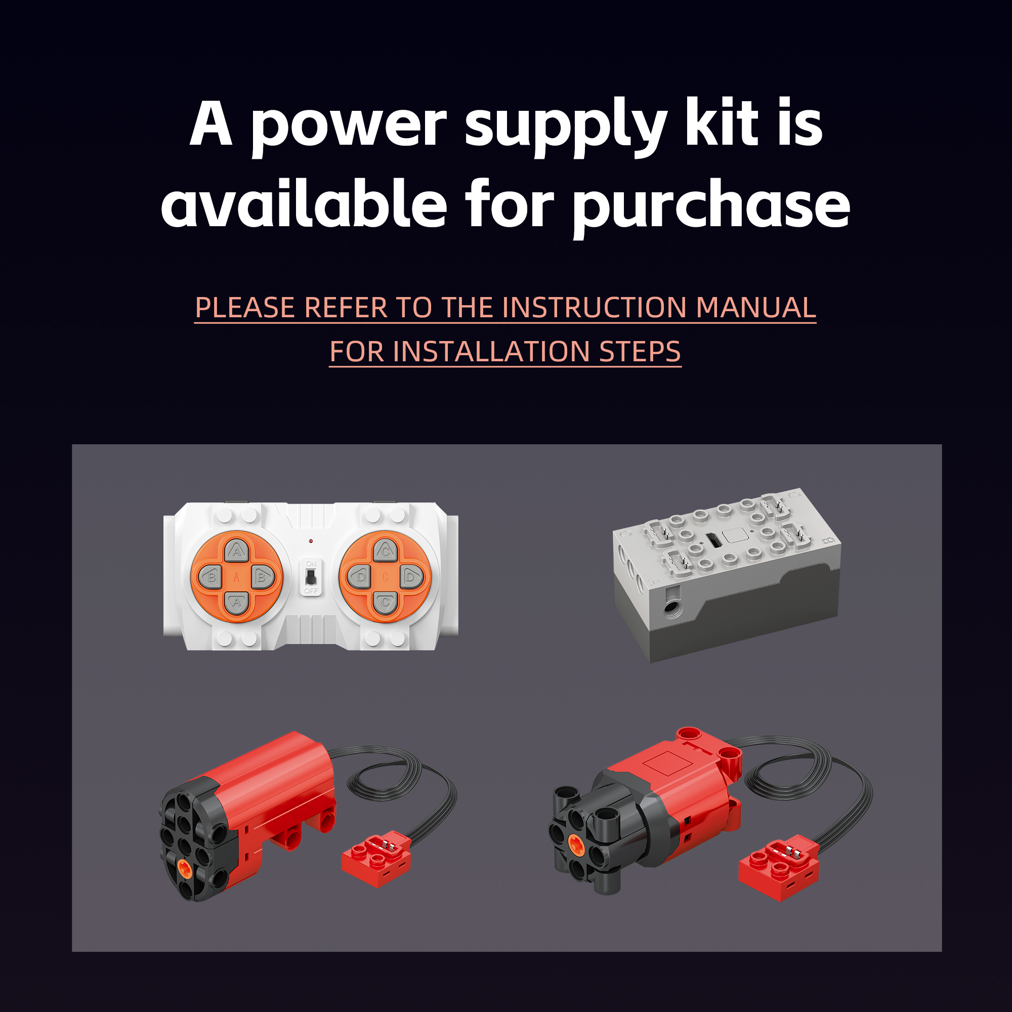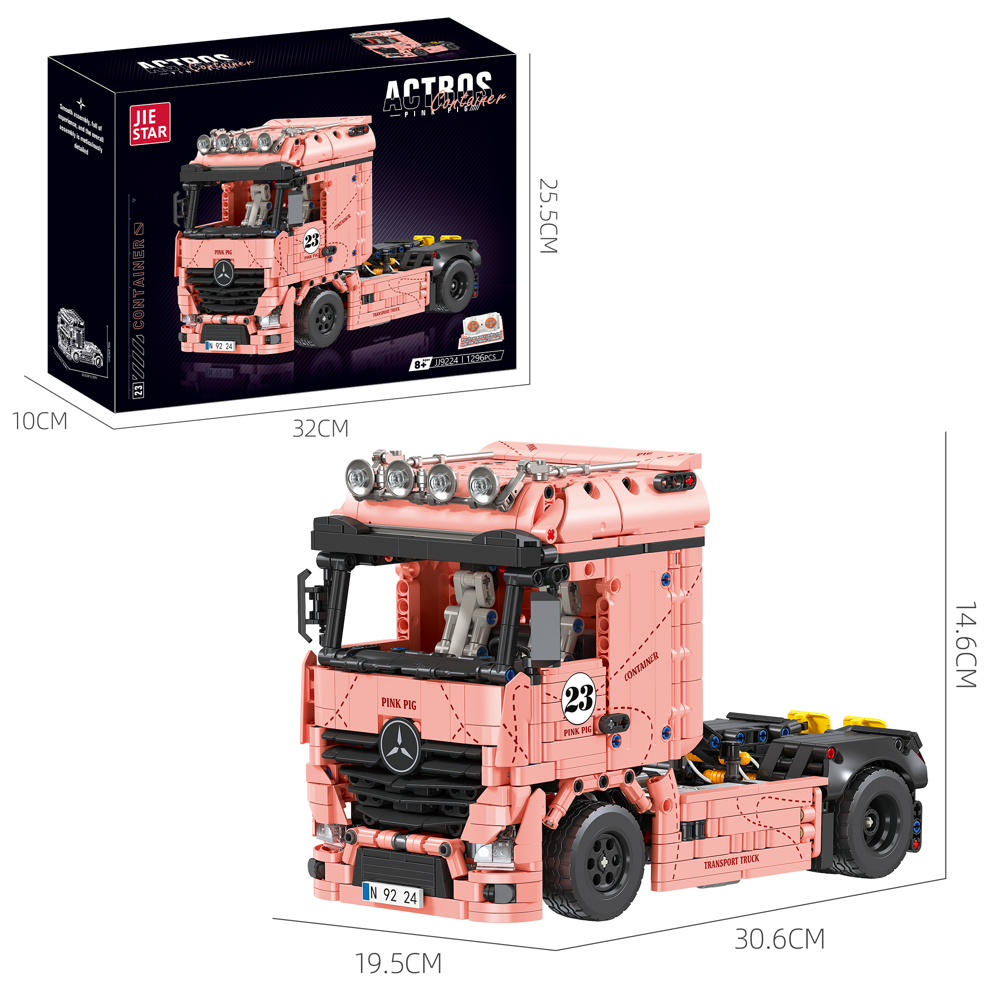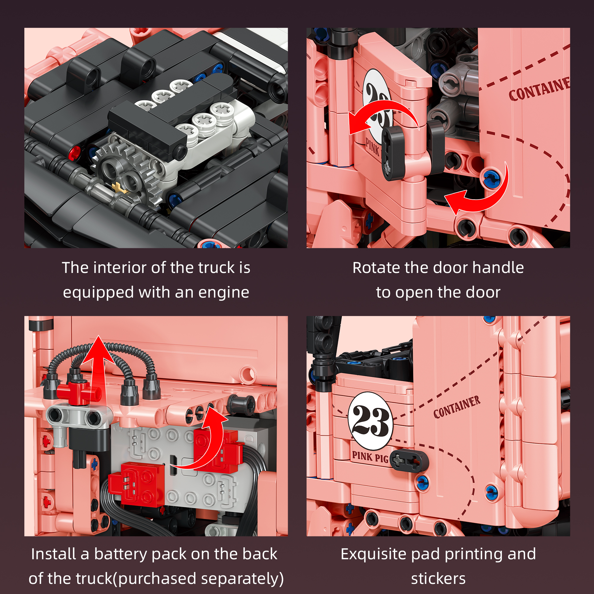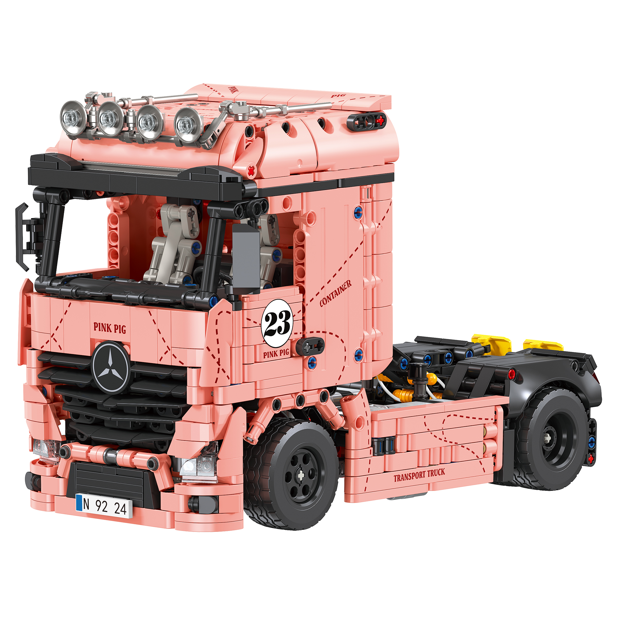 DIY building blocks assemble to recreate the shape of a heavy-duty truck tractor. The truck features realistic interior details and includes engine elements. Turning the door handle opens the model. The front cab can be lifted upward. A battery pack can be installed on the back for an immersive control experience. Exquisite pad-printed stickers add to the look, highlighted by a striking pink color. The finished model is perfect for display and collection.
