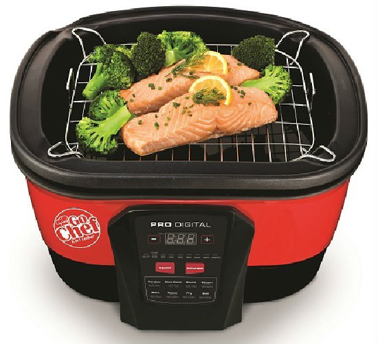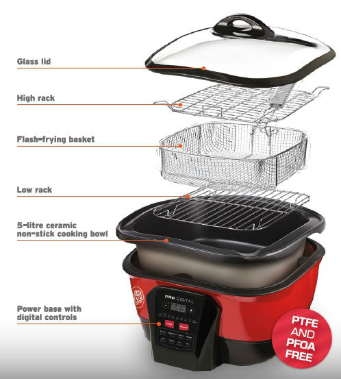 Go Chef Pro Digital comes with a low rack for roasting and baking, a high rack for steaming and a basket for flash frying. You also get a recipe guide, with more than 30 recipes for you try, from quick & easy snacks to full gourmet delights. Includes a Giant 5-litre bowl - make meals for up to 6 people! Has a Non-stick PTFE and PFOA free cooking surface. The Go Chef Pro Digital is easy to use and energy efficient.
