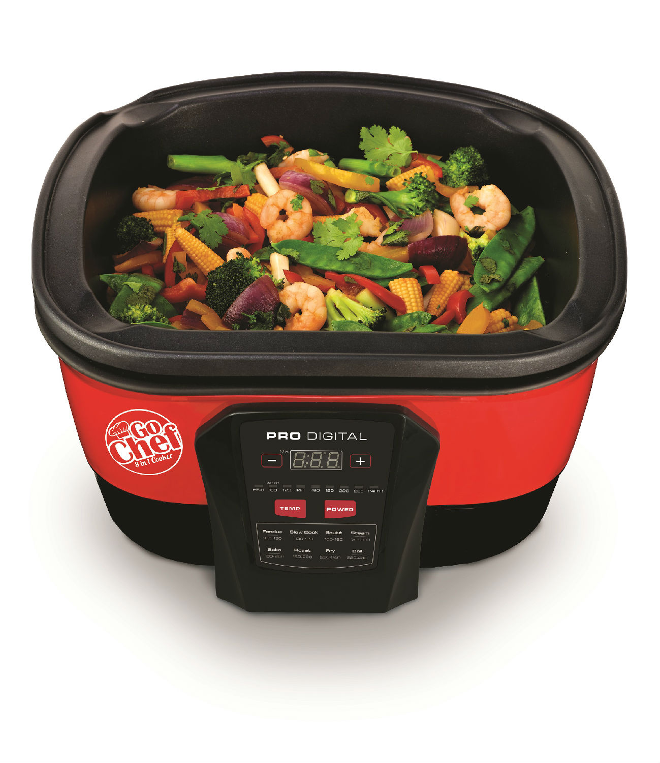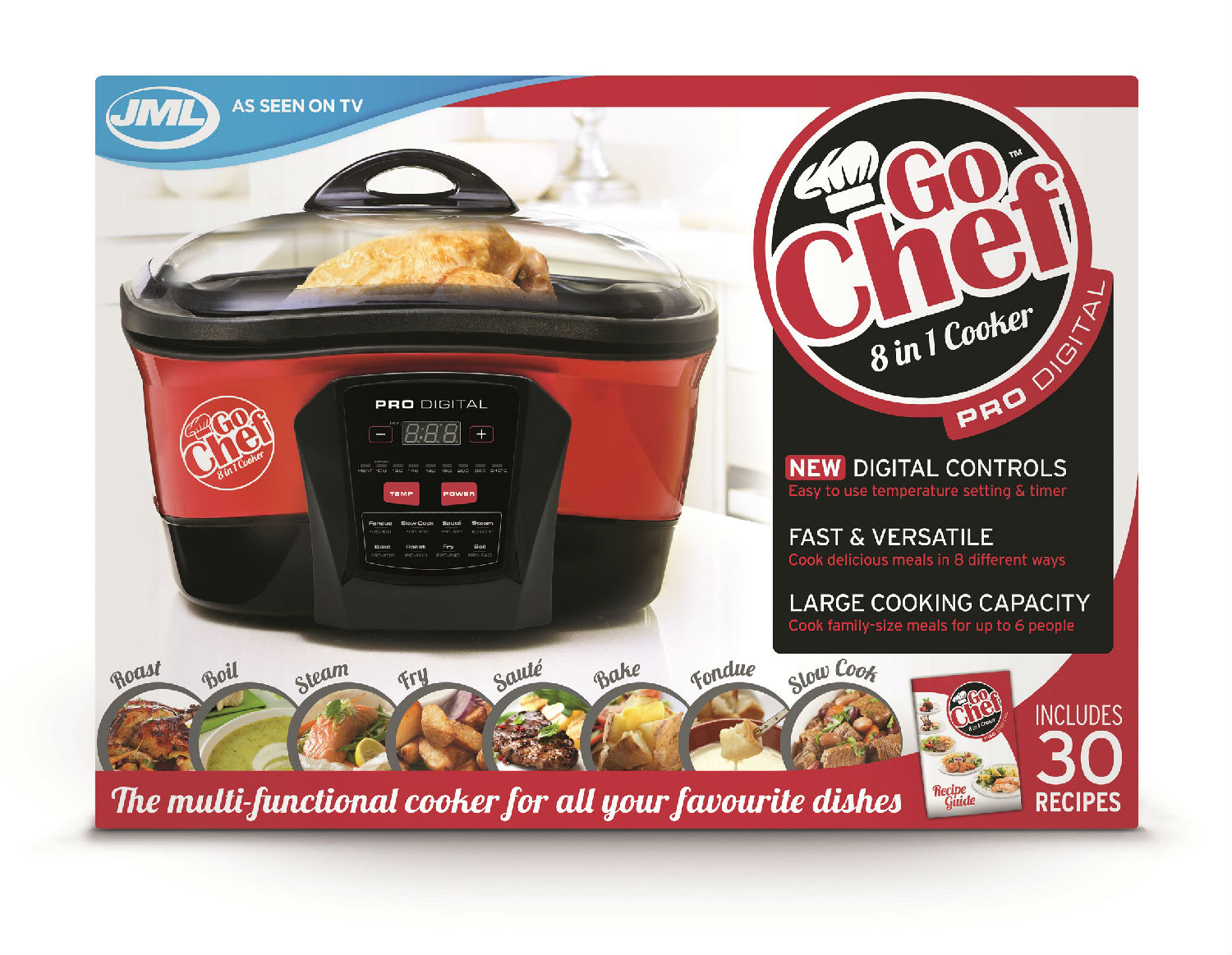 Go Chef Pro Digital is the incredible 8-in-1 cooker – you can bake, boil, sauté, fry, fondue, slow cook, steam and roast all in one bowl! Make delicious Sunday roasts and fry-ups, tasty risottos, pasta, chips, jacket potatoes, cakes and so much more. The giant 5-litre bowl gives you room to cook family size meals, and because it’s non-stick, clean-up is quick and simple. Temperature setting and timer are easy with the NEW Pro Digital controls.