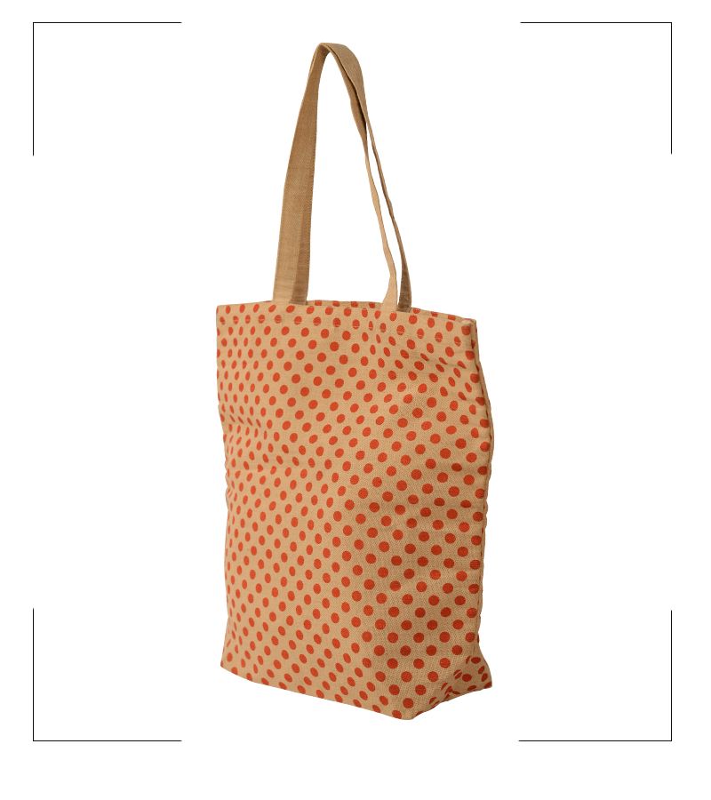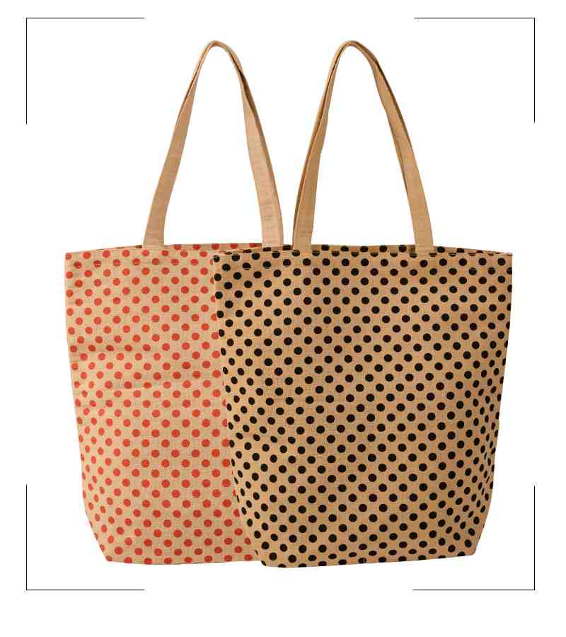 Natural Unlaminated Juco Bag with Allover Dot Print & Self Fabric Shoulder Handles.