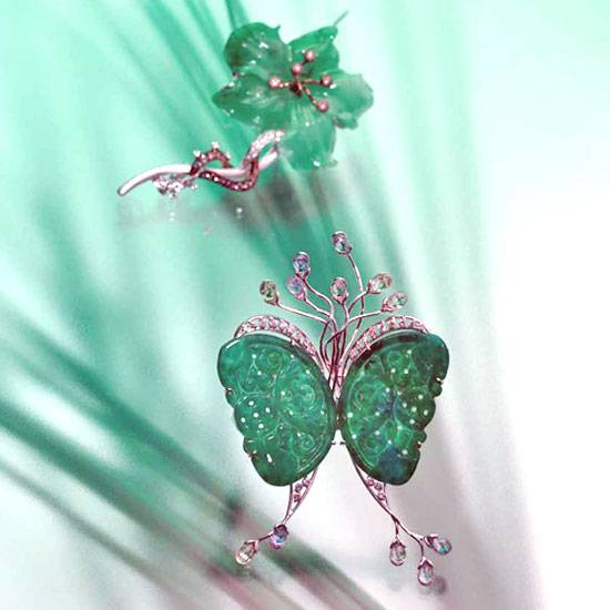 These are two jade brooches with transparent stones. One of the brooches, set with transparent stones on the scape of the flower, is designed with a flower motif. Another one, featuring two pieces of holed jades and small transparent stones, is with a butterfly motif.