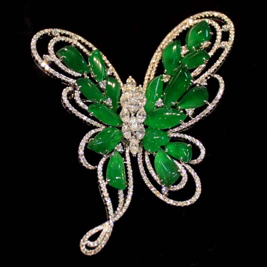 This beautiful brooch features a butterfly in a graceful form. The quality green jade and sparkling diamonds are blended perfectly together. The elegant design of the brooch goes well for grand occasions.