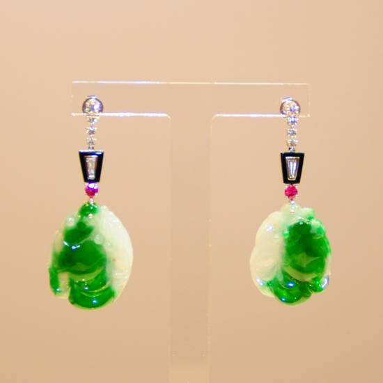 The featured item is a pair of drop jade earrings. The jade piece is flat and features unique white and lush green two-toned colours. It also comes with carvings of a fish on each piece, matching along with the colour tones.