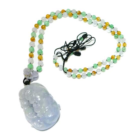 The featured necklace is stranded with multi-colored jade beads. The engraved jade pendant showcases exquisite craftsmanship. Let the colors of nature dazzle on your neckline with this stunning jade necklace.