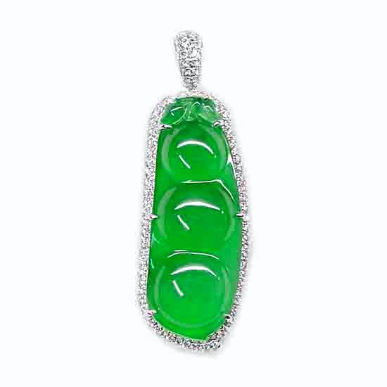 This eye-catching pendant boasts a unique pea design. It features sparkling white diamonds and green garnets all over. This stylish diamond pendant is appropriate for special occasions.