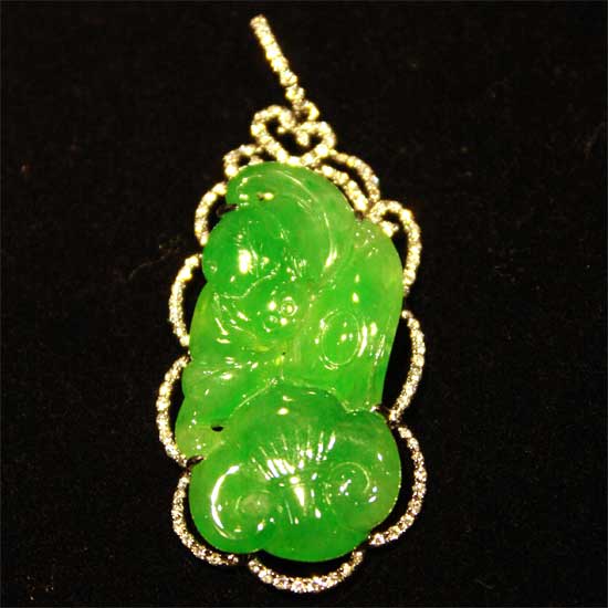 The featured jade pendant features a cute monkey design of the jade. The pendant is embellished with dazzling diamonds for added style. This pendant perfects jewelry items like necklaces.