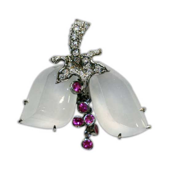 This graceful jade pendant showcases delicate craftsmanship with attention to details. The icy jadeite is carved with a polished surface while the sparkling stones in purple shimmer with irresistible charm. Add a touch of mystique to your ensemble with this jade pendant.